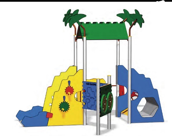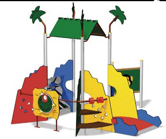 Structure multijeux composée de panneaux ludiques, d'une rampe et d'une cabane.