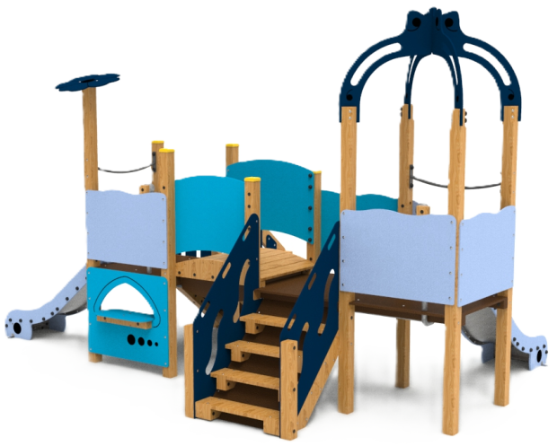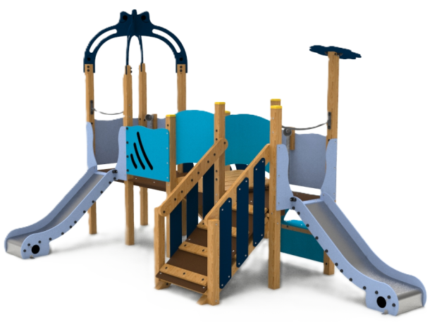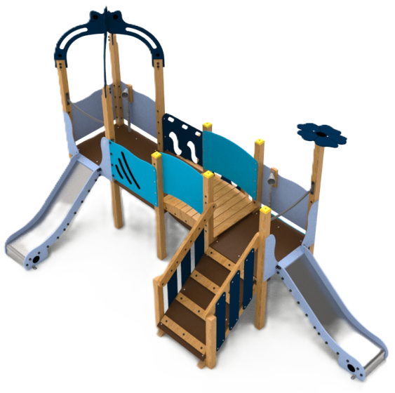 Jeu composé de deux tours, d'une passerelle et de deux toboggans.