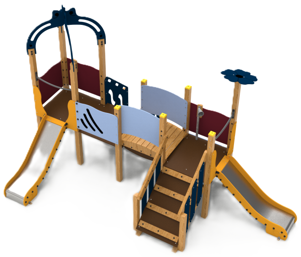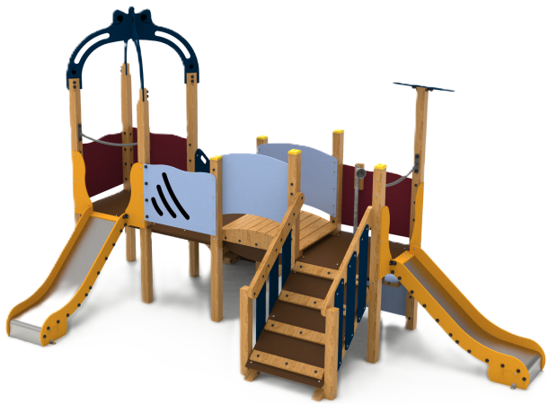 Jeu composé de deux tours, d'une passerelle et de deux toboggans.