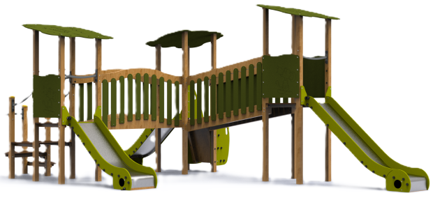 Équipements ludiques intégrés : toboggans, passerelles, échelles, ponts et murs d’escalade.