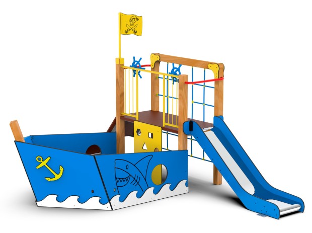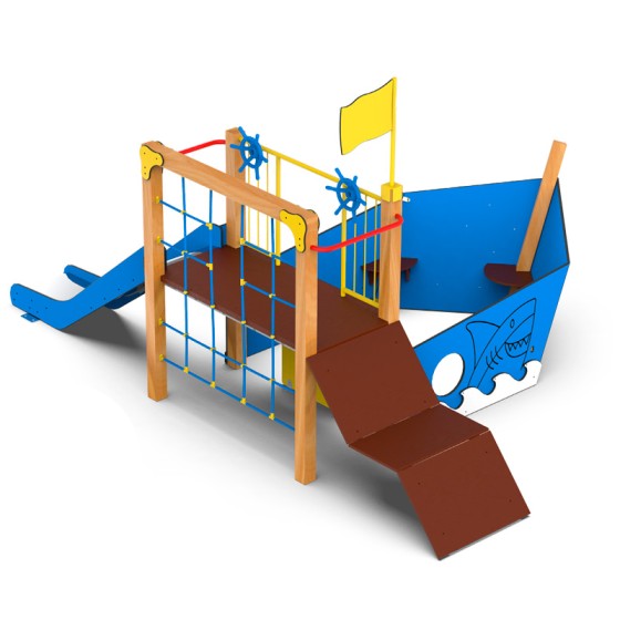 Jeu en forme de bateau qui comprend un toboggan, une rampe d’escalade, une plateforme, un banc pour s’asseoir à la proue du bateau, un filet d’escalade, une structure d’escalade et deux barres pour diriger le bateau.